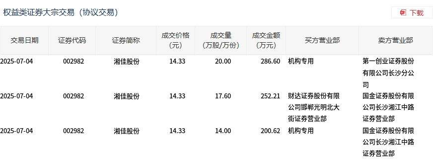 7月4日,湘佳股份大宗交易成交51.6万股,成交额739.43万元,占当日总成交额的3.69%,成交价14.33元,较市场收盘价15.99元折价10.38%。