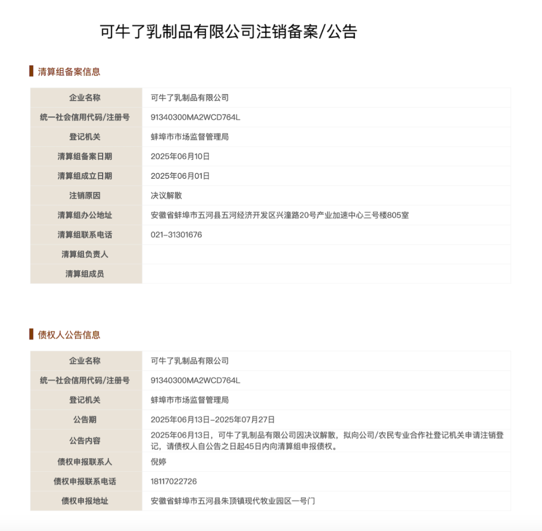 小食代从上述注销公告中了解到,2025年6月13日,注册地位于安徽蚌埠市的可牛了乳制品有限公司因决议解散,拟向公司/农民专业合作社登记机关申请注销登记。清算组备案信息显示,清算组是在6月1日成立的;同时,债权人公告信息也一并发出,公告期截至7月27日。