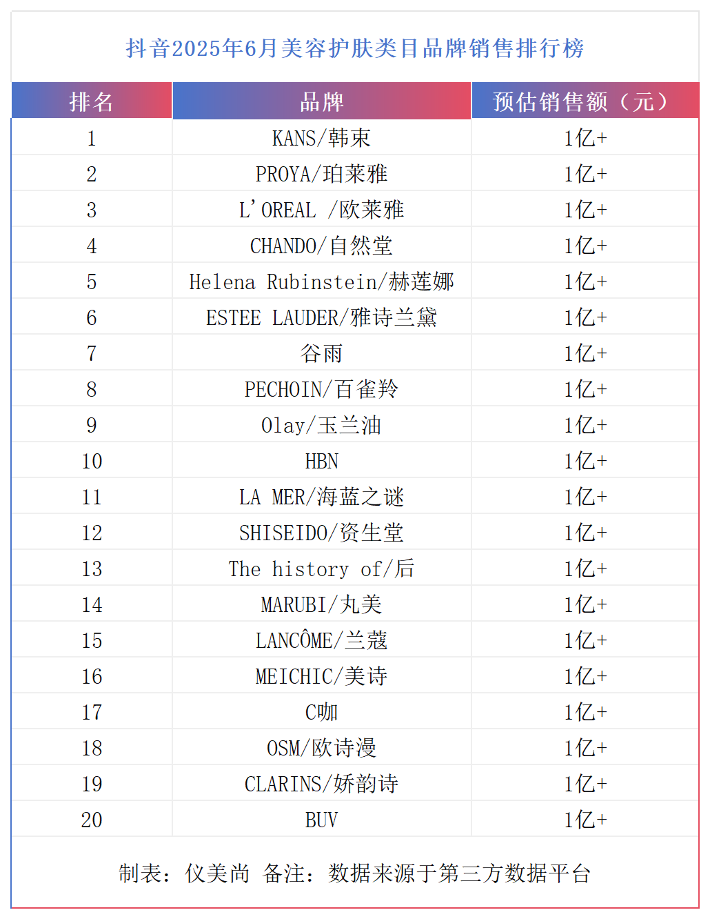 第三方平台数据显示,6月,抖音电商美妆品牌(美容护肤+彩妆)有36个品牌预估最高销售额达到1亿元(含7500万元-1亿元),环比5月份的49个下降了26.5%。