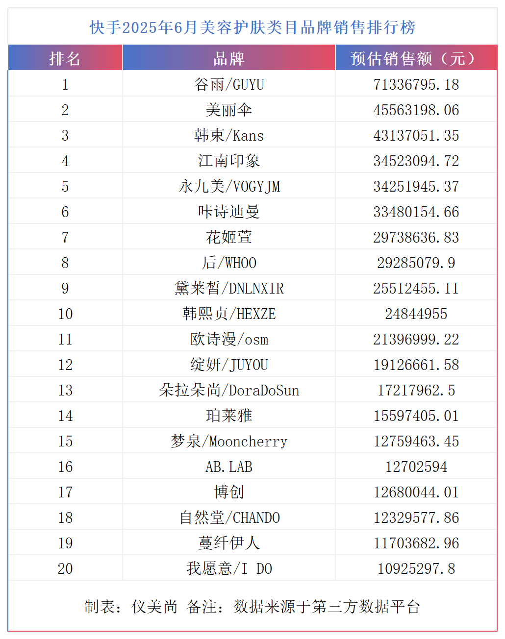 而在快手平台,美容护肤类目品牌销售额TOP20排行榜上依然以“快品牌”为主,谷雨以7134万元的预估销售额重新夺回第一,不过相较于4月份,少卖了2700多万元。