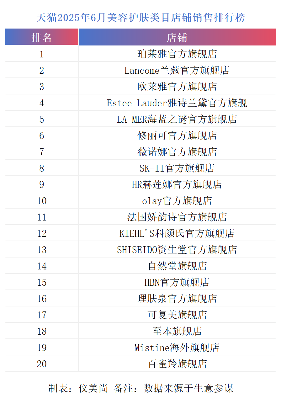 生意参谋后台数据显示,天猫美容护肤类目销售TOP20品牌店铺中,国际品牌店铺占据13席,比5月份少2席。其中,Mistine海外旗舰店为新上榜店铺。值得注意的是,肌肤之钥、娇兰和馥蕾诗这3个品牌,5月齐刷刷冲入榜单,但又在6月份“不约而同”掉榜。