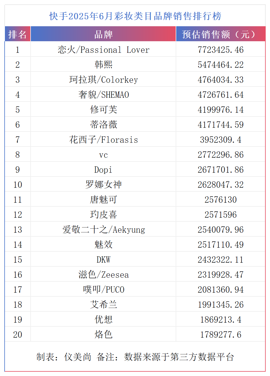 快手平台的彩妆,表现依然比较弱势。第三方平台数据显示,快手彩妆类目销售TOP20排行榜中,丸美旗下的恋火以772万元预估销售额位居第一名,其次为韩熙和珂拉琪,预估销售额分别为547万元、476万元。