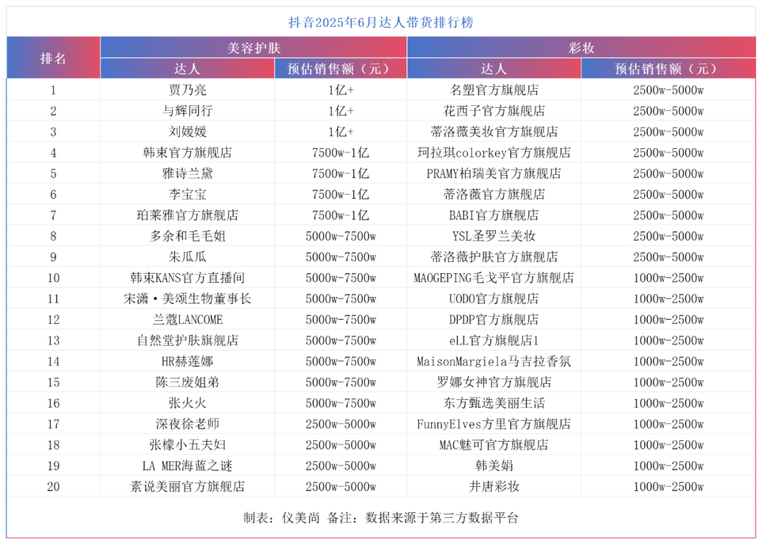 第三方平台数据显示,6月美容护肤类目销售TOP20带货达人排行榜上,一共只有7人的最高预估销售额达到1亿元,数量环比下滑61%。彩妆类目无一账号销售破亿。
