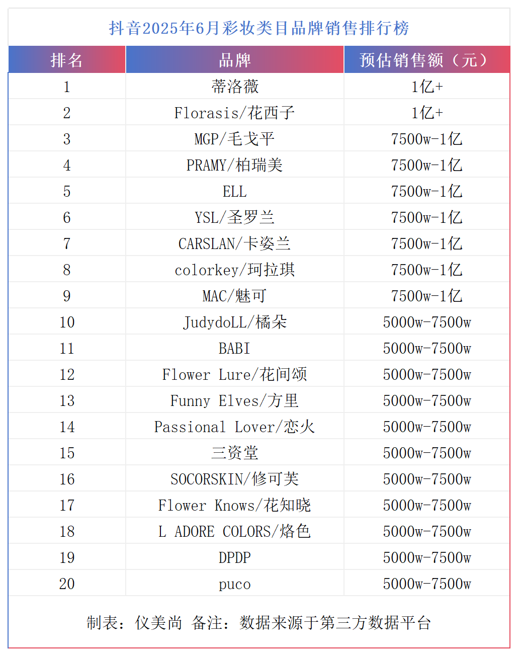 在抖音彩妆类目销售TOP20排行榜,蒂洛薇蝉联第一,创下“三连冠”纪录。紧随其后的是花西子和毛戈平。国际品牌中仅有YSL圣罗兰、MAC魅可两个品牌上榜。