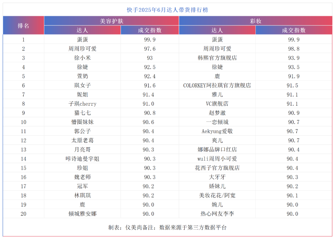在快手,美容护肤和彩妆类目的带货达人第一、二位,均被蛋蛋和周周珍可爱占据。