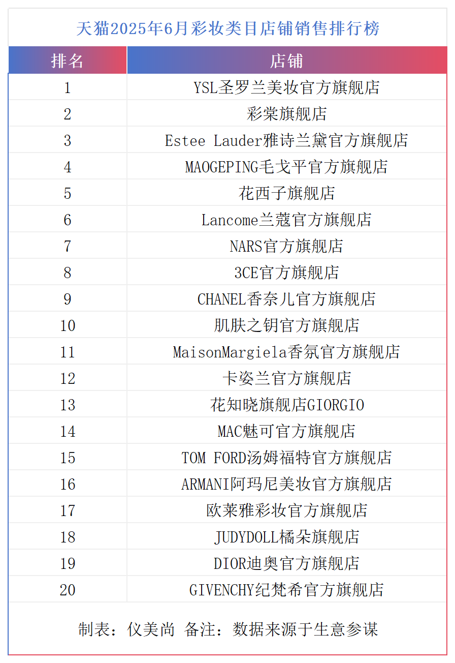 国际品牌方面,YSL圣罗兰美妆位居第一,其已连续十个月高居榜首。5月份上榜的植村秀、玫珂菲和芭比波朗的官方店铺此番则跌出榜单。
