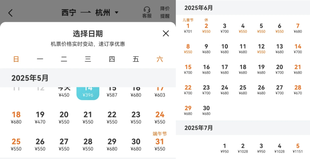 惊蛰研究所也在社交媒体注意到,有网友在5月查看西宁至杭州的机票,结果数据显示,6月初机票价格还在550元左右,但从6月底开始,机票价格明显上涨。到7月初,西宁至杭州的机票价格已经超过1000元,涨幅超过80%。