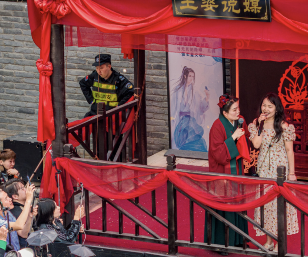 2024年3月,万岁山武侠城打造的特色节目“王婆说媒”在短视频平台爆火,此后“专职太监”“巨人斗舞”等特色节目也通过短视频平台,持续为景区带来曝光。而在游玩体验方面,万岁山武侠城80元的门票,不仅包含各种实景演出、非遗演出、音乐节和大型巡游,游客们还可以在景区内使用银票道具和全场NPC兑换礼品。