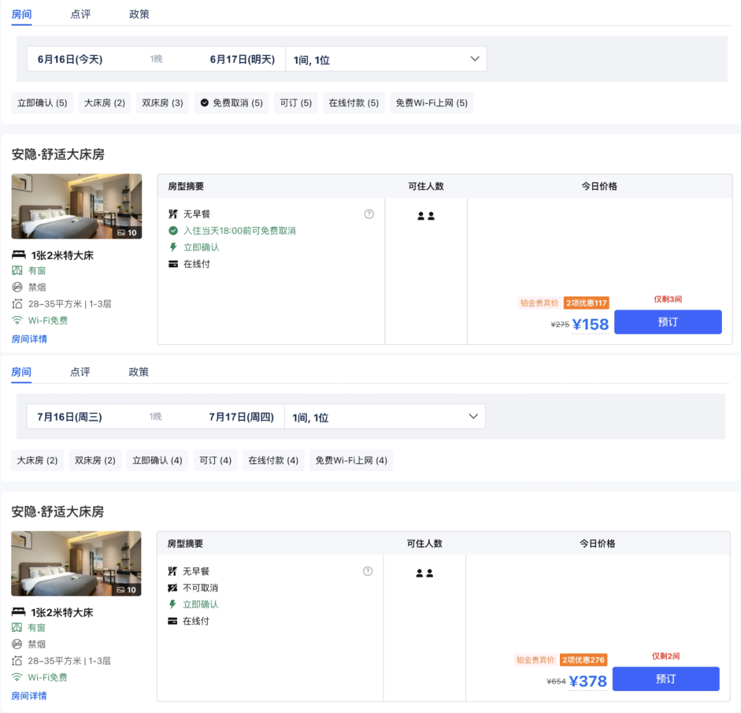 住宿成本在淡旺季的差距也非常明显。惊蛰研究所在携程平台看到,云南丽江古城的一家全季酒店大床房,在6月16日的价格为342元,但在一个月后的7月16日,价格涨到了436元,涨幅达到27%。相同时间段,另一家民宿的大床房,也从6月16日158元,涨价到了7月16日378元,涨幅超过139%。