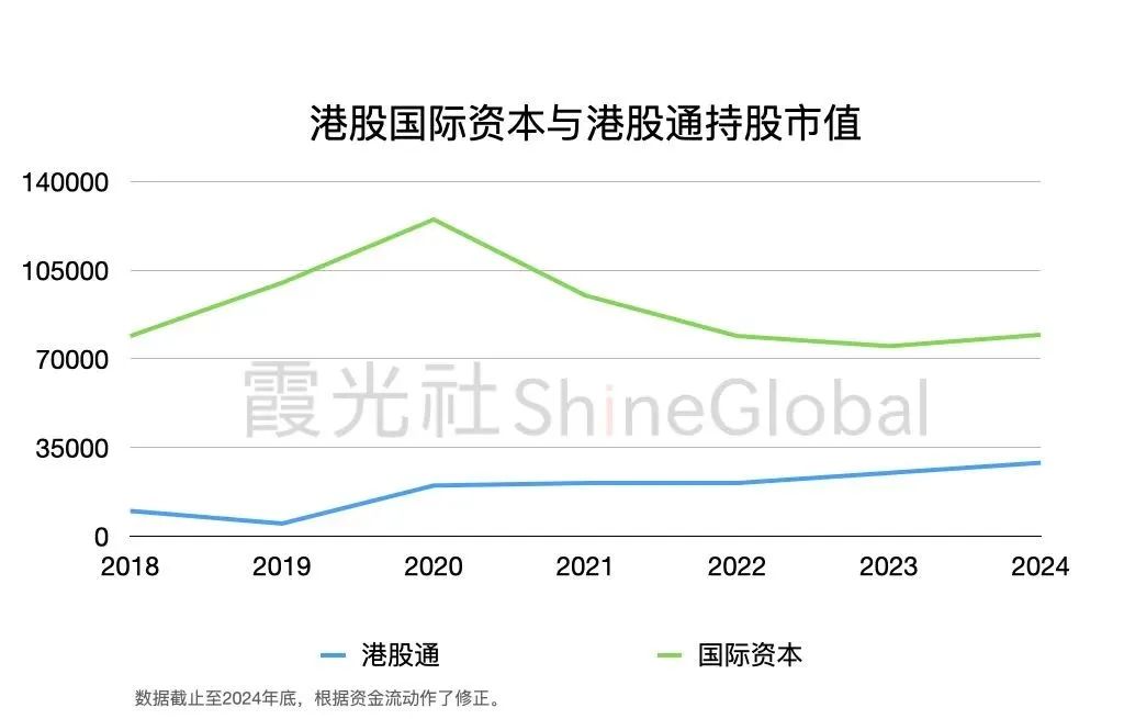 而到了当下时点,中国资产定价权也逐步向中国资本转移。从持仓比例上看,纵向来看,香港本地机构持股市值占比相对稳定,国际中介机持股占比逐年下降,内资通过港股通持续流入,持股占比逐年增加。