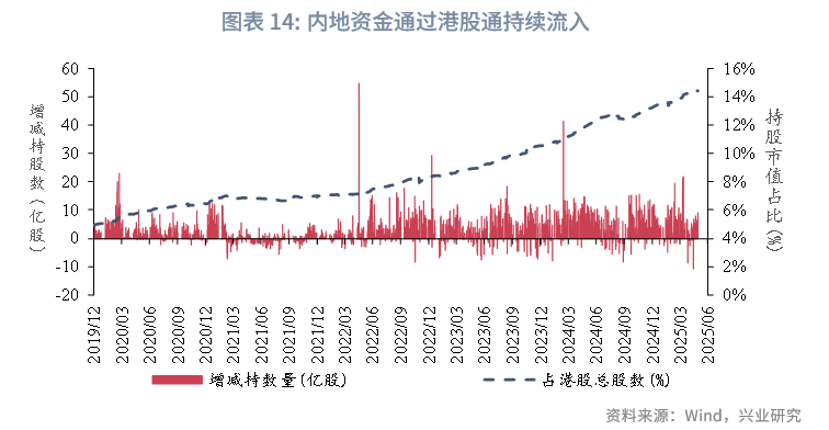 变化发生在2024年之后。据兴业研究在分析,2024年2月后AH溢价与中债利率同向变动,表明港股利率锚发生了结构性迁移,港股通持续流入背景下内地资金定价权提升。而随着港股通机制的持续深化和内地资金参与度的提升,港股的估值利率锚从“单一美元锚”转向“美债为主,中债边际定价”的双重驱动机制。