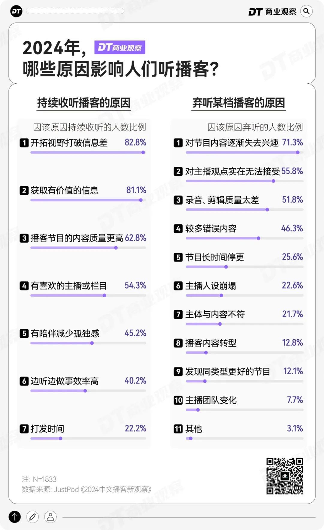 《2024中文播客新观察》报告显示,人们收听播客主要有两个原因,一是开拓视野、获得有价值的信息;二是获得陪伴感和情绪价值。