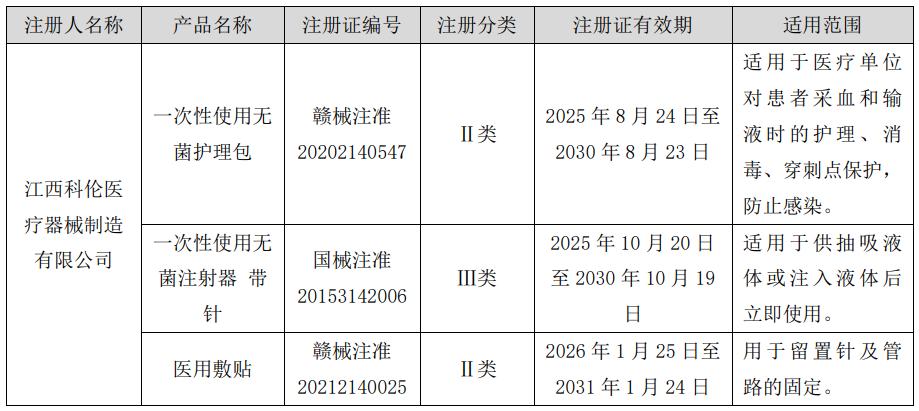 上述注册证为原有产品的延续注册,有效期限分别由原2025年8月23日到期变更为2030年8月23日到期,原2025年10月19日到期变更为2030年10月19日到期,原2026年1月24日到期变更为2031年1月24日到期。