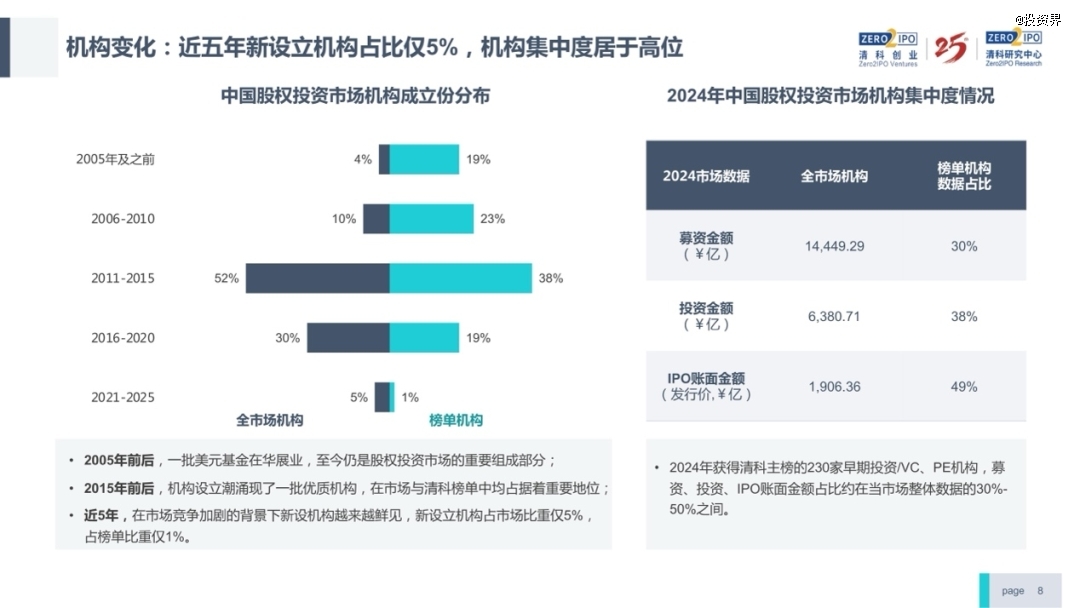 往回看,那个时期正值国内风投大爆发。正如清科研究中心数据显示,当前国内活跃的投资机构,52%是在2011-2015年成立,堪称当下市场的中坚力量;此外2016-2020年成立的机构占比为30%,两者相加占一级市场的比重超过八成,集中度非常高。