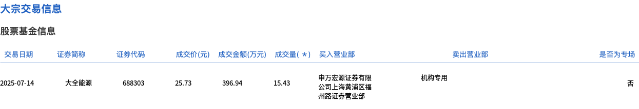 7月14日,大全能源大宗交易成交15.43万股,成交额396.94万元,占当日总成交额的0.9%,成交价25.73元,较市场收盘价25.73元持平。