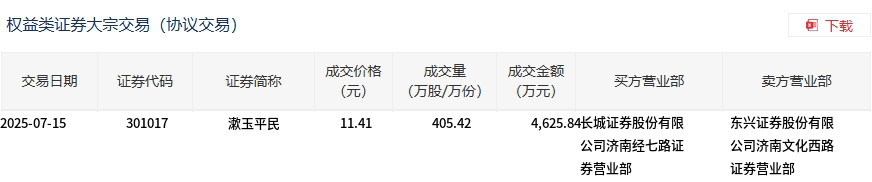 7月15日,漱玉平民大宗交易成交405.42万股,成交额4625.84万元,占当日总成交额的45.49%,成交价11.41元,较市场收盘价12.38元折价7.84%。