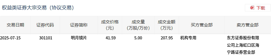 7月15日,明月镜片大宗交易成交5万股,成交额207.95万元,占当日总成交额的1.14%,成交价41.59元,较市场收盘价45.7元折价8.99%。