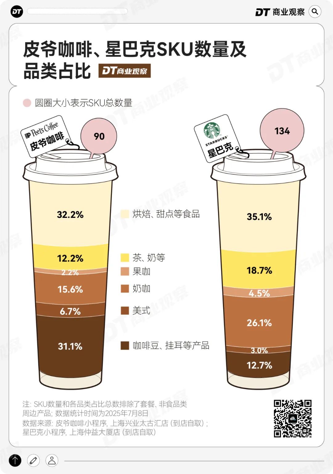 我们通过对比线下门店的小程序菜单发现,皮爷菜单更精简,SKU总数大概比星巴克少1/3(90vs134)。
