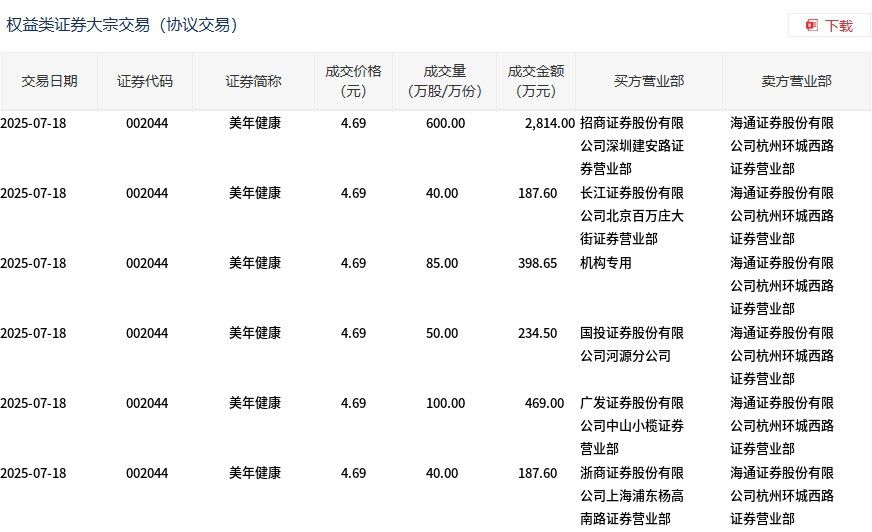 7月18日,美年健康大宗交易成交915万股,成交额4291.35万元,占当日总成交额的9.42%,成交价4.69元,较市场收盘价5.09元折价7.86%。