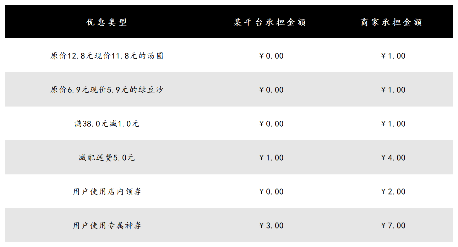 成都某外卖代运营企业负责人刘峰告诉《财经故事荟》,他合作的一个外卖商家,商品降价、店内券、满38元减1元补贴部分全部由商家承担补贴;5元配送费商家承担4元,平台承担1元;专属神券活动商家承担7元补贴,平台仅承担3元。