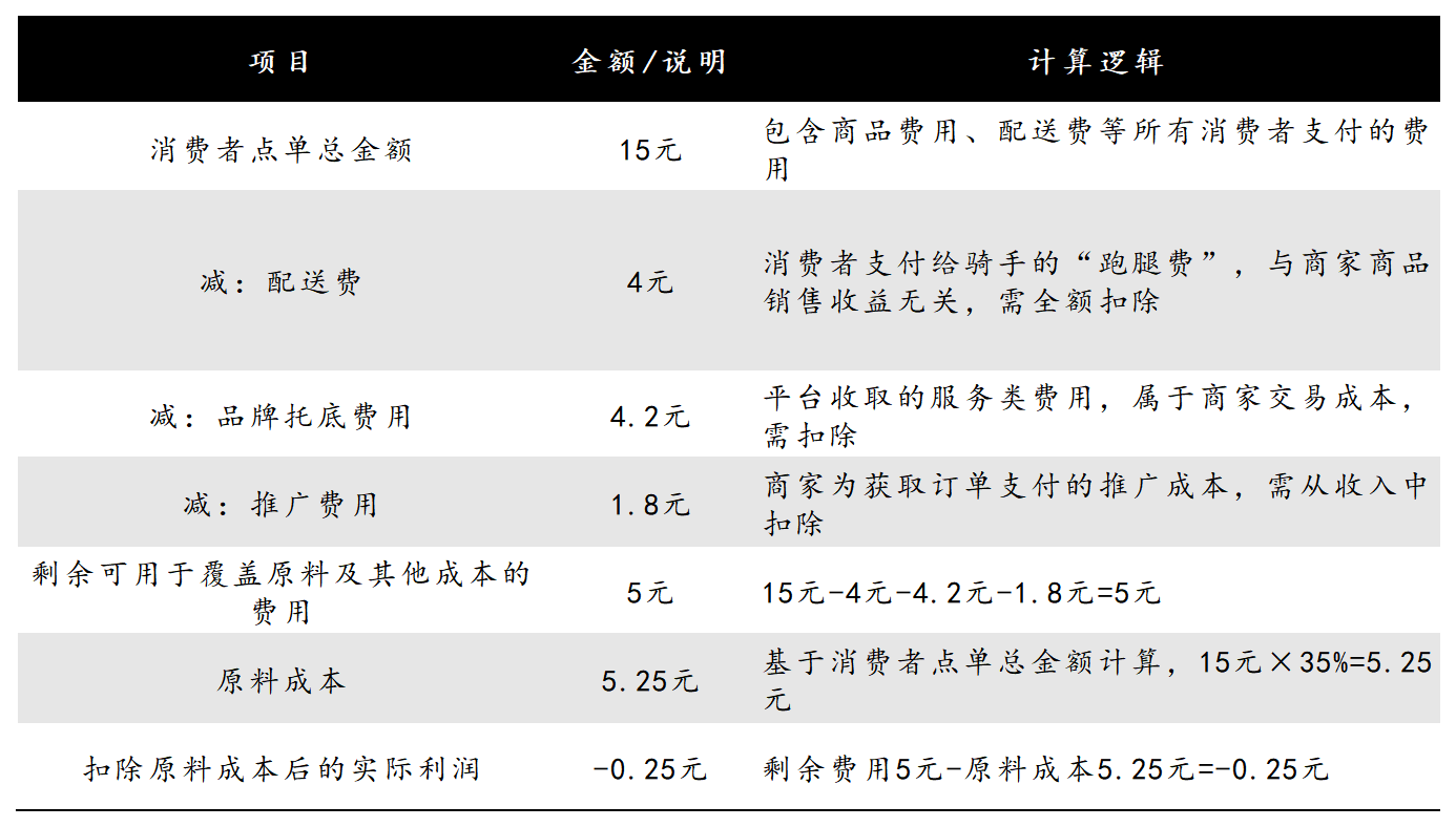 前述加盟商算了一笔账,在扣除原料成本后,低价外卖订单在不考虑房租、水电、人员工资等成本之下,已单均亏损0.25元(5-15×35%=-0.25)。