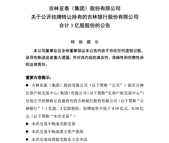 根据公告,亚泰集团拟通过长春产权交易中心,分两笔公开挂牌转让其持有的吉林银行3亿股股份,整体挂牌底价合计12.57亿元。