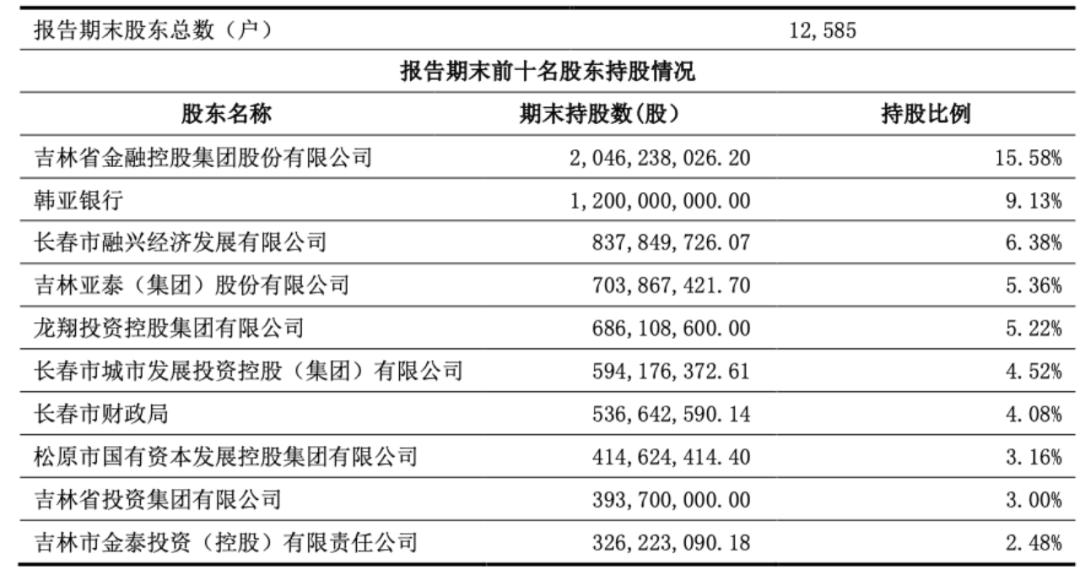 截至2025年一季度末,吉林银行股东总数12585户,吉林省金融控股集团股份有限公司(以下简称“吉林金控”)以15.6%持股比例居首,第二大股东为持股9.13%的韩亚银行。