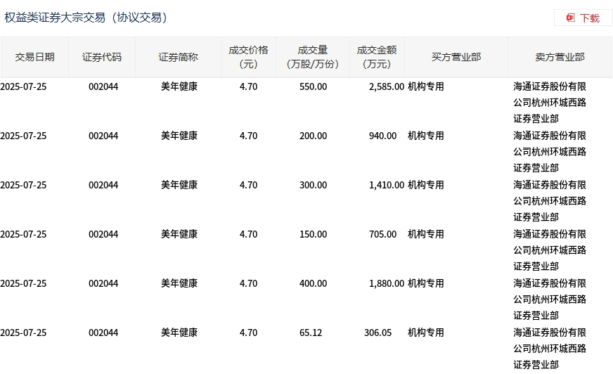 7月25日,美年健康大宗交易成交1665.12万股,成交额7826.05万元,占当日总成交额的19.36%,成交价4.7元,较市场收盘价5.14元折价8.56%。