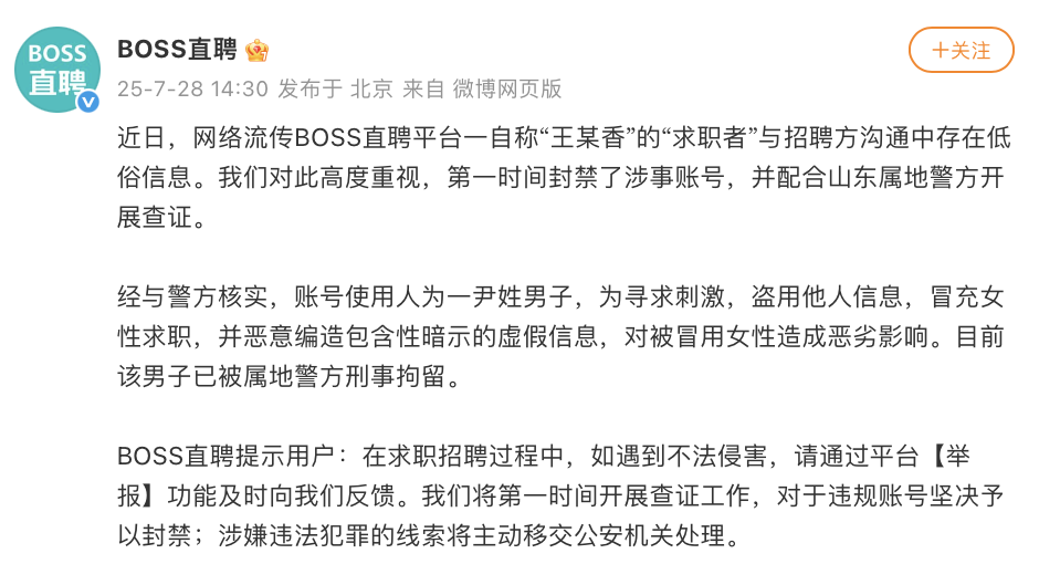 7月28日,@BOSS直聘 发文称,近日,网络流传BOSS直聘平台一自称“王某香”的“求职者”与招聘方沟通中存在低俗信息。公司对此高度重视,第一时间封禁了涉事账号,并配合山东属地警方开展查证。