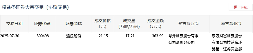 7月30日,温氏股份大宗交易成交17.21万股,成交额363.99万元,占当日总成交额的0.36%,成交价21.15元,较市场收盘价17.63元溢价19.97%。