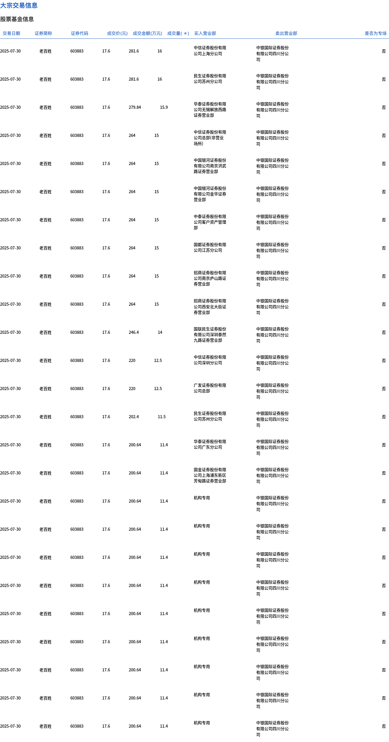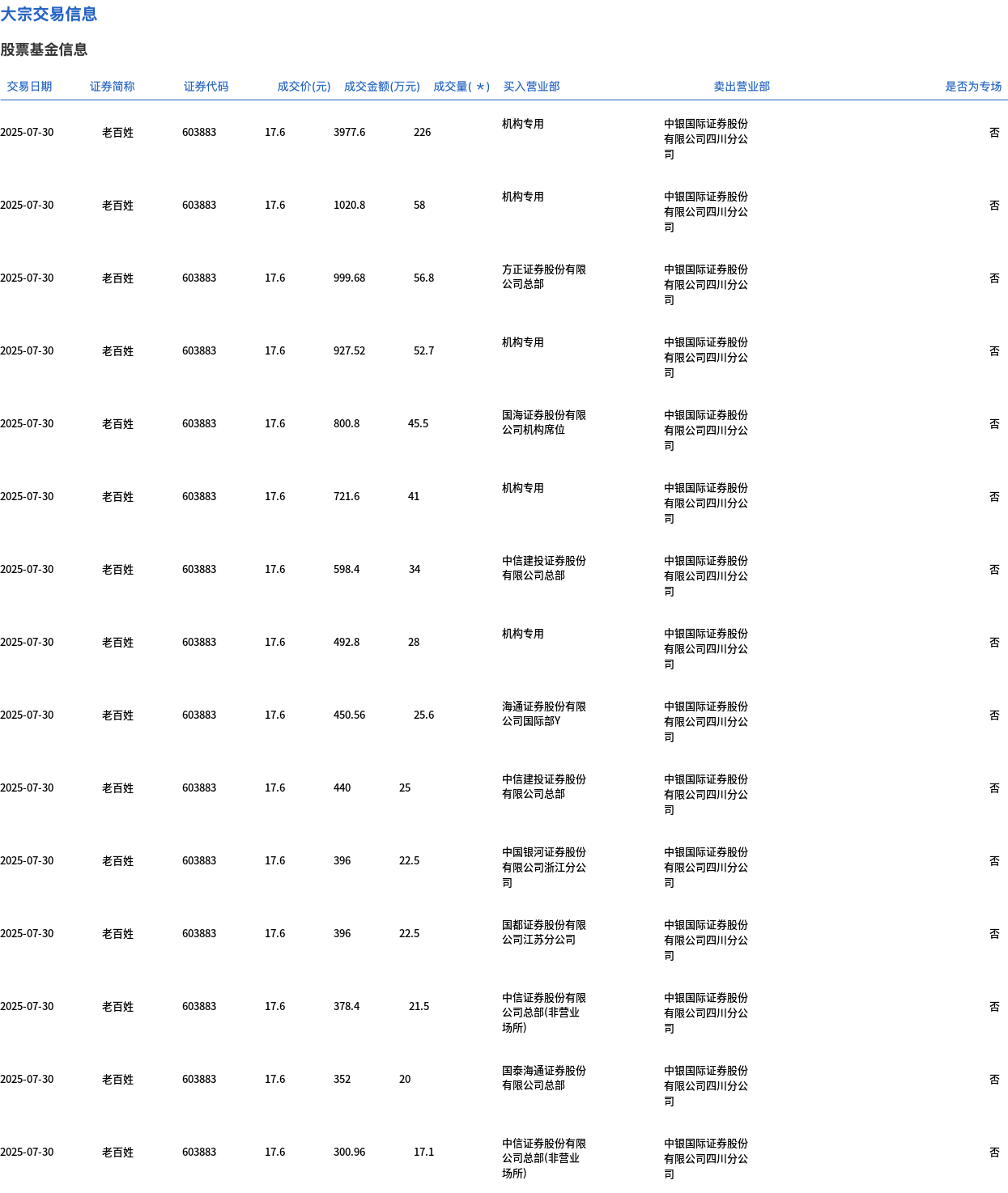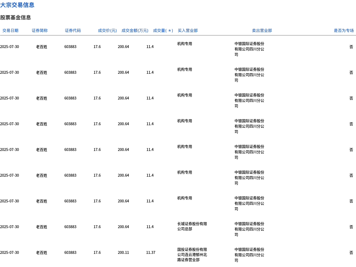 7月30日,老百姓大宗交易成交1127.57万股,成交额1.98亿元,占当日总成交额的20.31%,成交价17.6元,较市场收盘价19.69元折价10.61%。