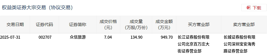 7月31日,众信旅游大宗交易成交134.9万股,成交额949.7万元,占当日总成交额的3.27%,成交价7.04元,较市场收盘价7.6元折价7.37%。