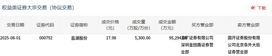 8月1日,盐湖股份大宗交易成交5300万股,成交额9.53亿元,占当日总成交额的51.03%,成交价17.98元,较市场收盘价17.99元折价0.06%。