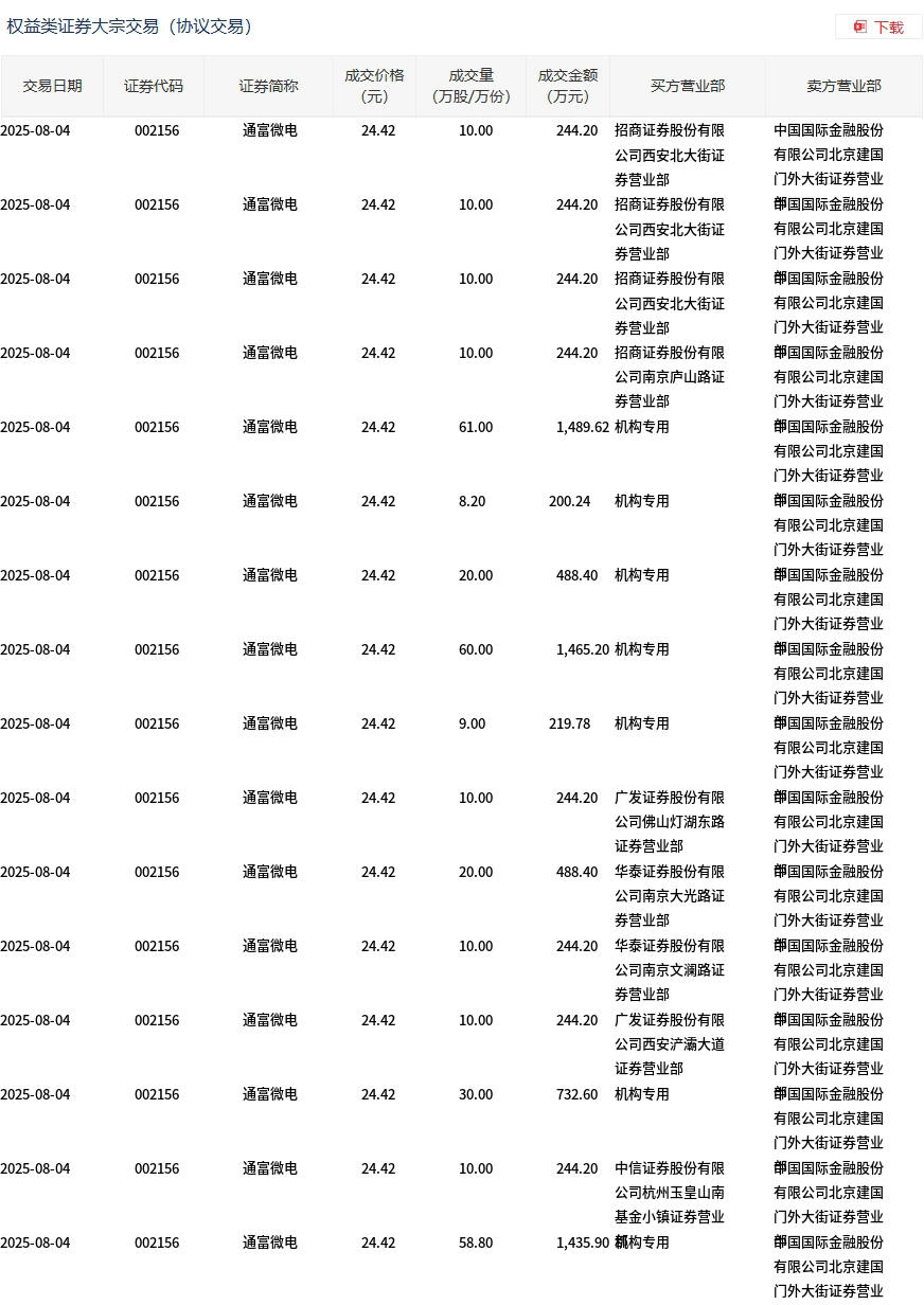 8月4日,通富微电大宗交易成交347万股,成交额8473.74万元,占当日总成交额的9.45%,成交价24.42元,较市场收盘价27.11元折价9.92%。