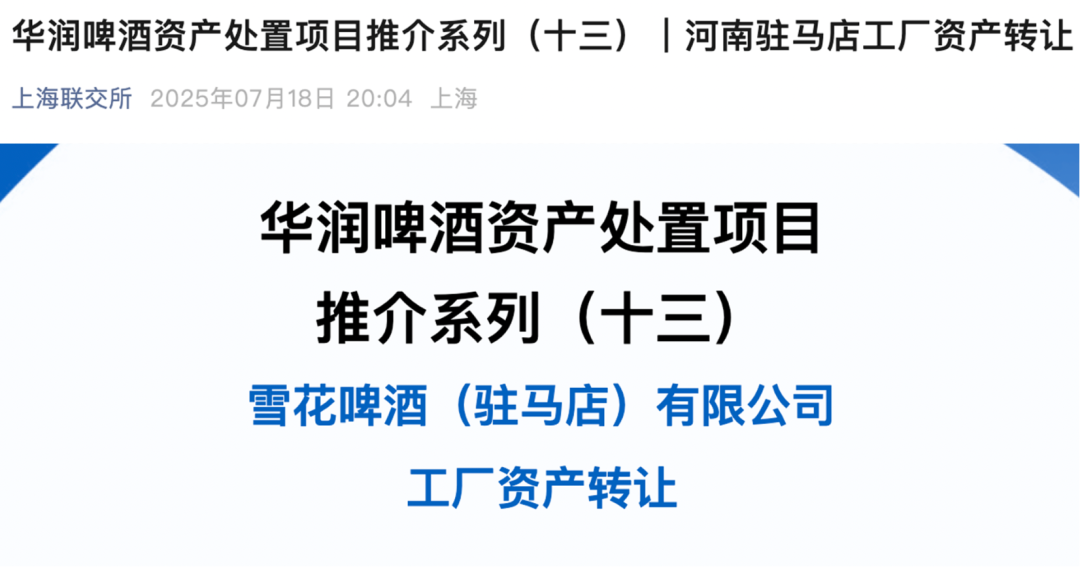 近日,酒讯从上海联交所公众号获悉,3个华润啤酒资产处理项目正在推介。此次3处工厂资产转让项目分别为驻马店工厂资产、汕头工厂资产和达州工厂资产等。官方表示是为处置落后工厂。