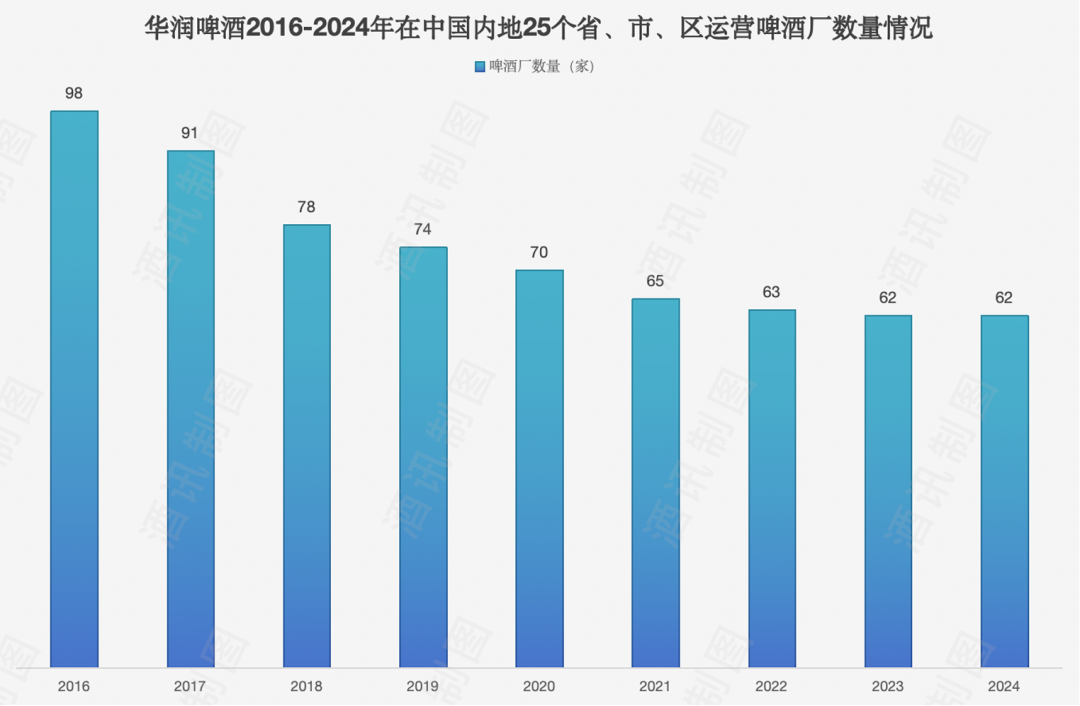 历年财报数据显示,2016—2024年,华润啤酒在中国内地25个省、市、区分别营运啤酒厂数量为98家、91家、78家、74家、70家、65家、63家、62家、62家。