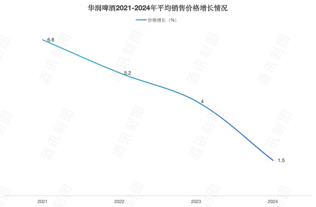 此外,拉长时间线来看,华润啤酒的平均售价增幅也在收紧。2021-2024年,华润啤酒整体平均销售价格分别增长了6.6%、5.2%、4%、1.5%,增长幅度逐年减小。