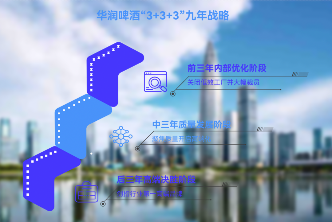 2016年,侯孝海通过“公开竞聘”机制出任华润啤酒总经理并旋即升任CEO。随后2017年,华润啤酒提出“3+3+3”九年战略,即前3年刀刃向内、关闭低效工厂、大幅裁员;中3年聚焦质量发展,开启高端化;后3年“决胜高端”,剑指行业第一高端啤酒品牌。