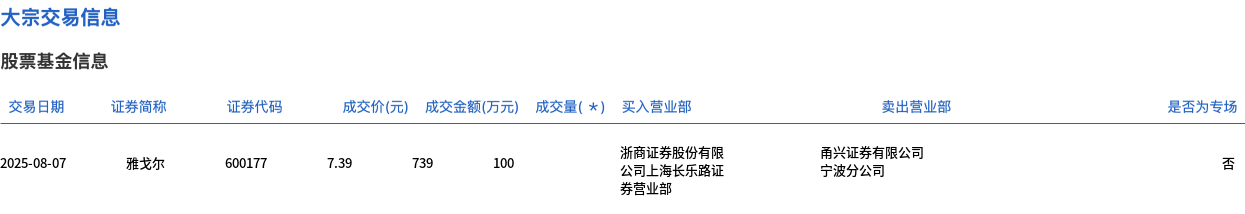 8月7日,雅戈尔大宗交易成交100万股,成交额739万元,占当日总成交额的6.03%,成交价7.39元,较市场收盘价7.44元折价0.67%。