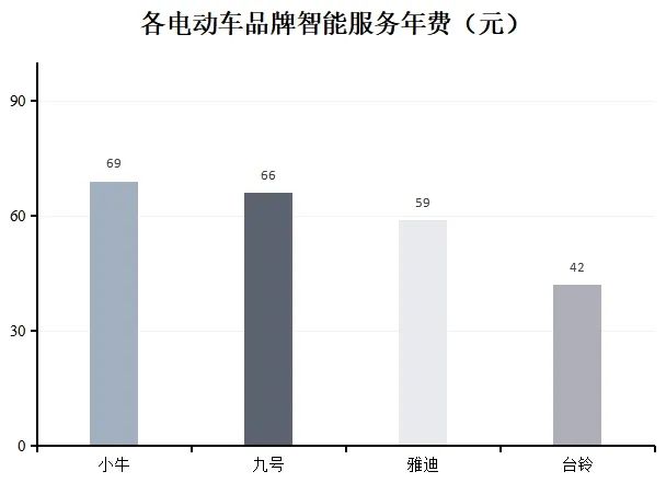 从价格上来看,在电动车品牌里,小牛的智能服务收费目前最高(一年69元),其次是九号66元,有九号用户表示通过更换4G云盒、老带新等活动,智能服务费用有不同程度的减少;雅迪和台铃等品牌的智能费用分别在59元/年、42元/年。