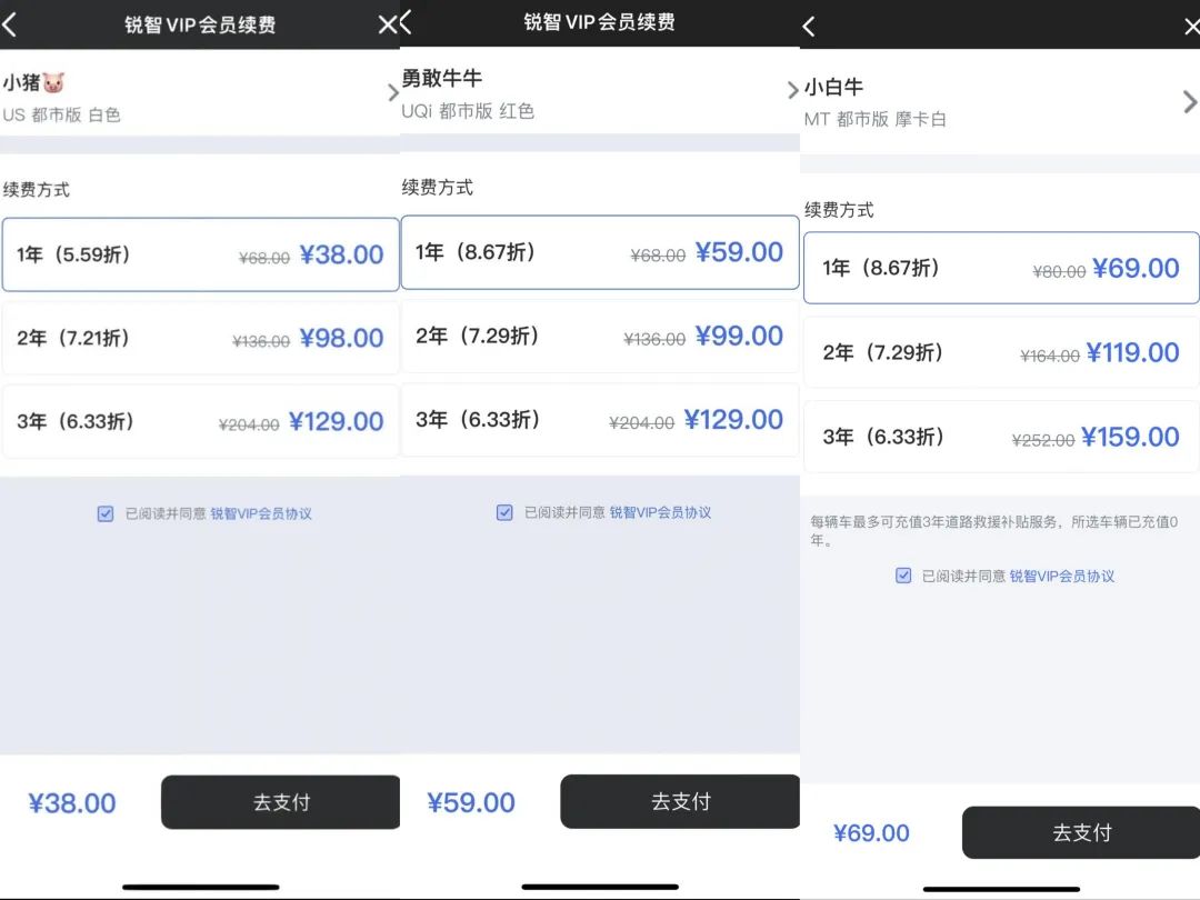 最近,不少小牛电动车的老用户发现,订阅增值服务的费用越来越贵。从早期的38元/年,到2021年的59元/年,到如今涨到了69元/年,三年套餐价格从原本的129元涨到了159元,且90天未续费的话,将永久丧失部分功能。