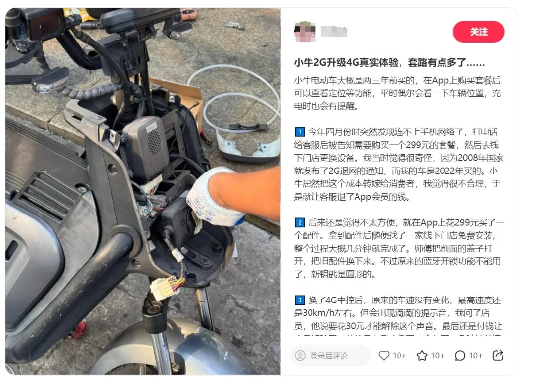 不少小牛用户发现,自己的电动车就出现了这种情况。由于一些小牛车型的中控仅支持2G,出现了锐智VIP还在有效期,车辆的智能化功能却无法使用的情况。部分用户只能被迫自费299元升级4G才能恢复智能功能,而升级期间仍需要支付未中断的服务费。