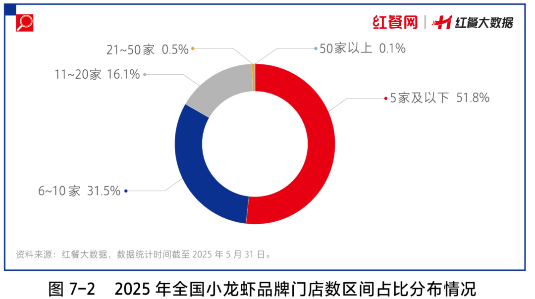 总体来看,小龙虾餐饮品牌的规模化程度不高。据红餐大数据,截至2025年5月,全国超八成的小龙虾品牌门店数规模在10家及以下。
