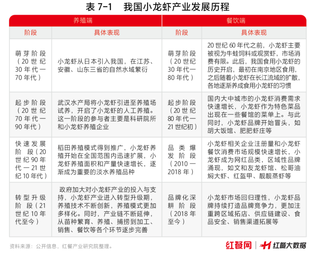 经过多年的发展,我国的小龙虾产业不断升级进化,在历经萌芽阶段、起步阶段、快速发展阶段后,当前已经进入转型升级阶段。