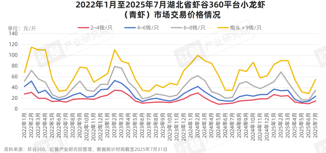 湖北省虾谷360平台数据显示,2025年6月6~8钱(1钱=5克)青虾、炮头青虾的均价跌至历年最低值,分别为17元/斤、29元/斤,较2025年1月均价分别下降了66.7%、65.1%。但从6月下旬开始,小龙虾行情陡然反转,价格节节攀升。截至2025年7月,6~8钱(1钱=5克)青虾、炮头青虾的平均价格分别上涨至35元/斤、55元/斤。