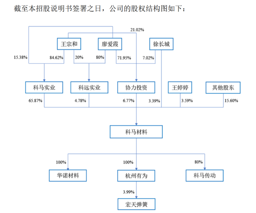 科马材料的控制权高度集中于王宗和家族。据《招股书》,科马材料实际控制人王宗和及其配偶廖爱霞,通过科马实业、科远实业、协力投资等主体,合计控制公司77.42%的股份。此外,王宗和的女儿王婷婷及女婿徐长城也分别持股3.59%和3.39%,一家人合计持股84.4%。