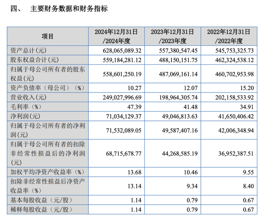 近几年科马材料营收呈现波动,2022-2024年,科马材料年营业收入分别为2.02亿元、1.99亿元、2.49亿元。净利润虽稳步提升,分别为4165万元、4904万元、7103万元,但与2021年7252万元的净利润仍存在差距。