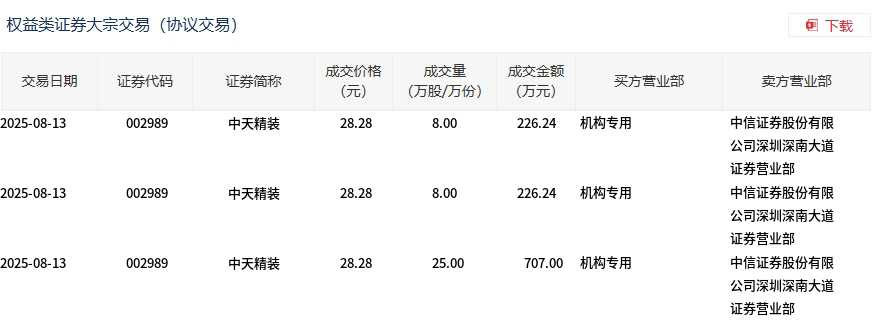 8月13日,中天精装大宗交易成交41万股,成交额1159.48万元,占当日总成交额的5.4%,成交价28.28元,较市场收盘价31.55元折价10.36%。