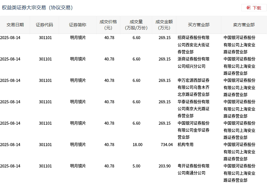 8月14日,明月镜片大宗交易成交56万股,成交额2283.69万元,占当日总成交额的4.68%,成交价40.78元,较市场收盘价46.16元折价11.66%。
