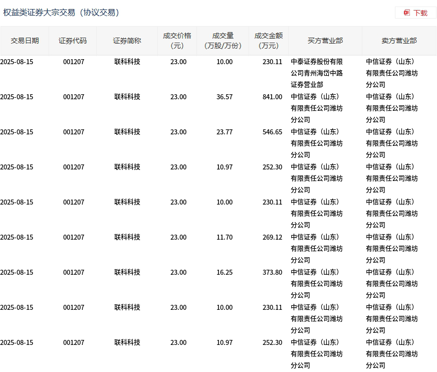 8月15日,联科科技大宗交易成交140.23万股,成交额3225.5万元,占当日总成交额的22.44%,成交价23元,较市场收盘价26.3元折价12.55%。